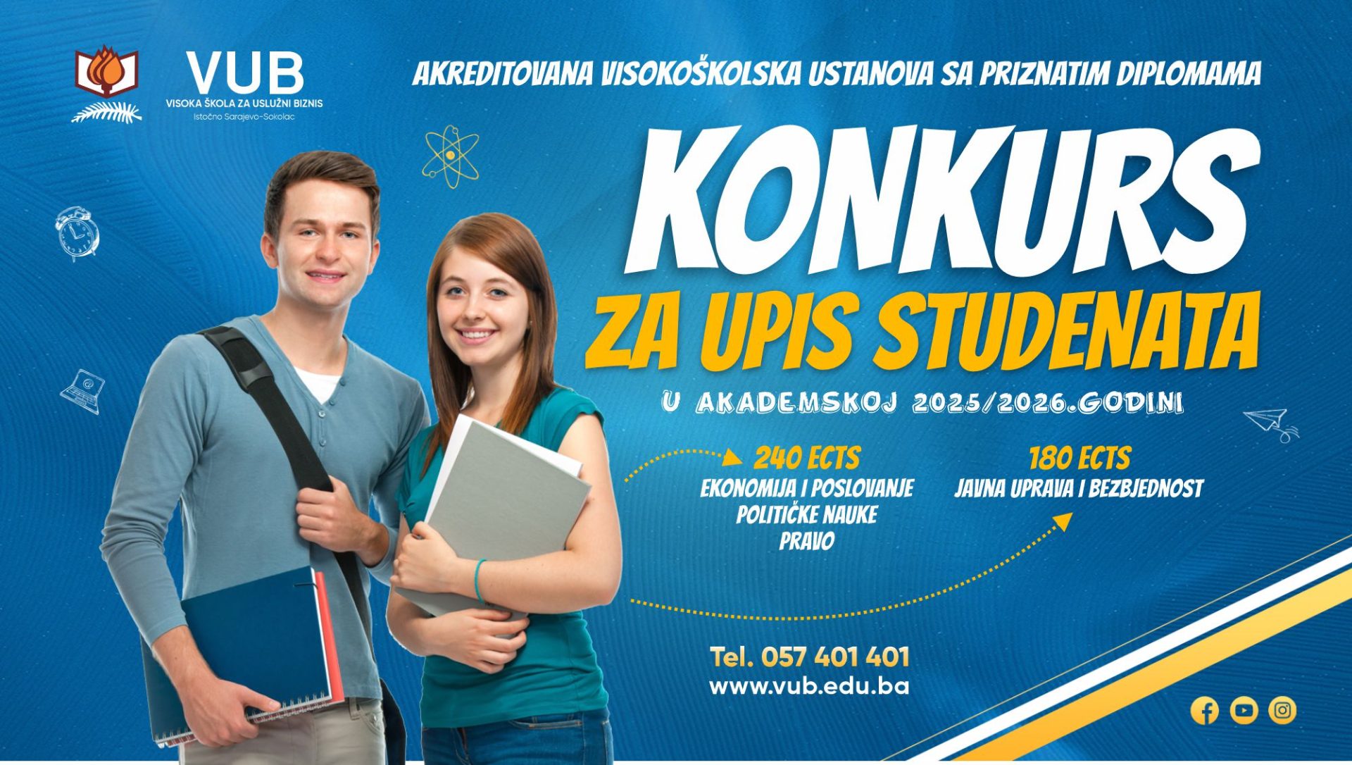 U skladu sa Dozvolama za rad Ministarstva prosvjete i kulture Republike Srpske br. 07.023/602-1351/09 od 25.02.2009. godine (trogodišnji studij) i br. 07.023/602-8211/09 od 22.12.2009. godine (četvorogodišnji studij) i Rješenja o upisu u registar visokoškolskih ustanova Ministarstva prosvjete i kulture Republike Srpske br. 07.023/600-3706/08 od 30.05.2008. godine, Visoka škola za uslužni biznis (VUB) raspisuje KONKURS za upis studenata u akademskoj 2025/26. godini.